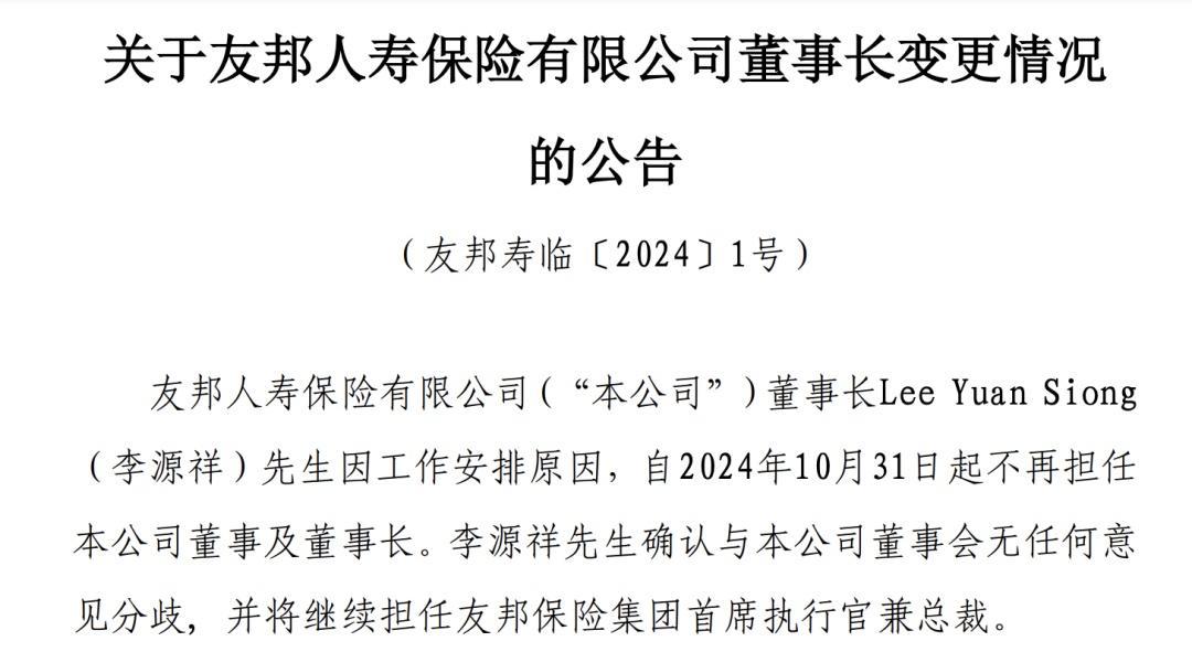 11月13日,友邦人寿发布公告称,公司董事长李源祥因工作安排原因,自2024年10月31日起不再担任本公司董事及董事长。李源祥确认与本公司董事会无任何意见分歧, 并将继续担任友邦保险集团首席执行官兼总裁。